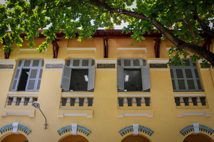 Những ô cửa sổ dạng mái vòm, được chấm phá tô điểm bằng men sứ xanh, tạo nét mềm mại, thơ mộng trong các phòng học.