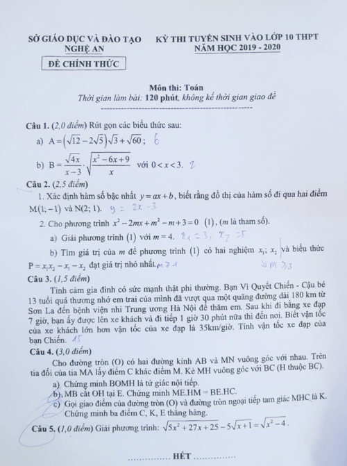 Sáng 7/6, các thí sinh Nghệ An bước vào môn thi Toán - môn thi cuối cùng của Kỳ thi tuyển sinh vào lớp 10. Sau buổi thi, nhiều thí sinh cho rằng đề thi tương đối khó. Những câu hỏi càng về sau lại càng phức tạp và đòi hỏi tư duy cao.