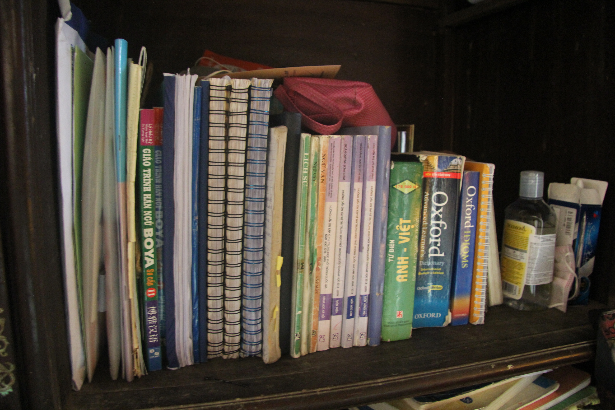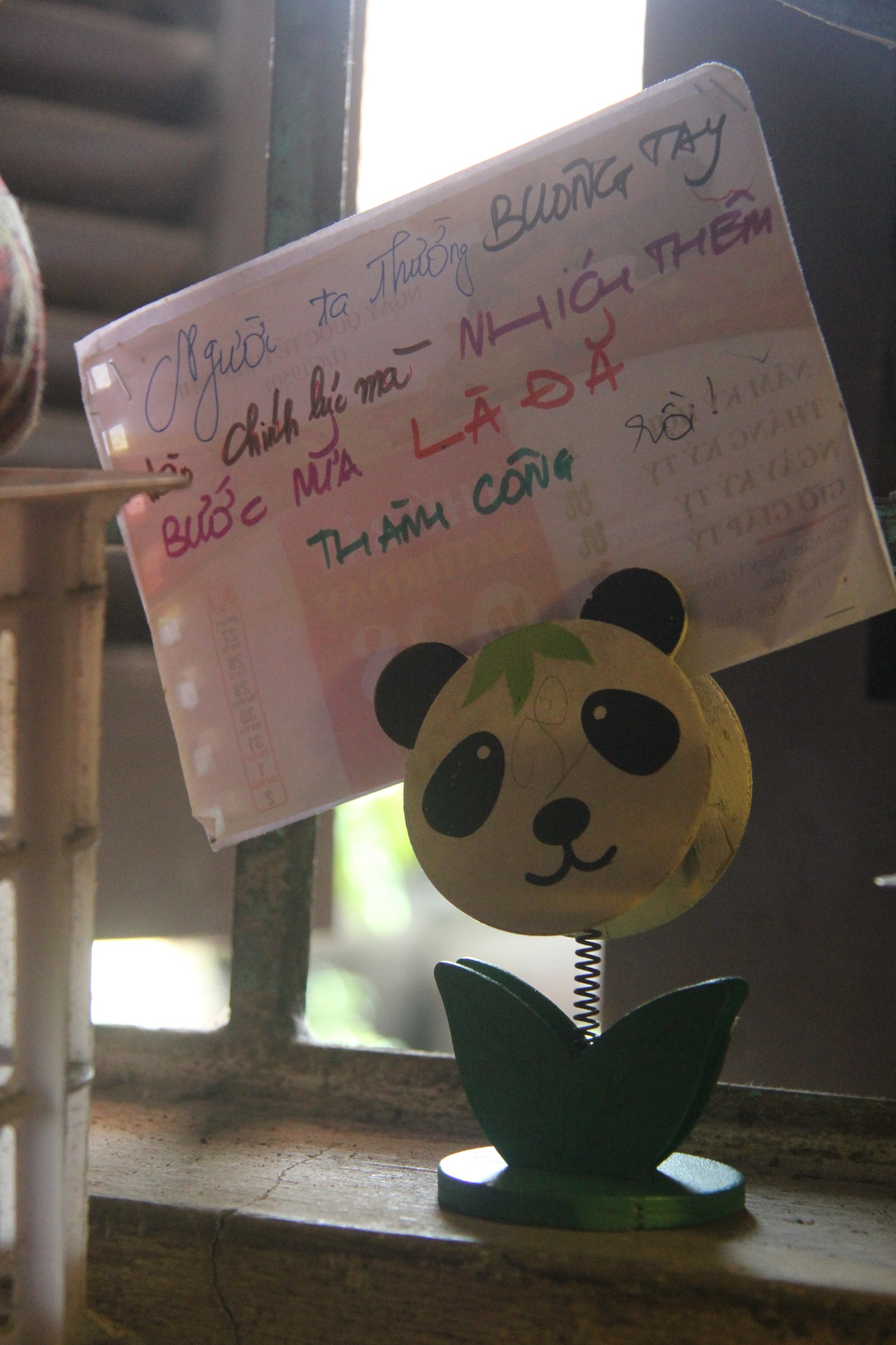 Góc học tập của thủ khoa khối D1 có rất nhiều câu nói My viết ra để làm động lực mục tiêu phấn đấu như quyết tâm vào đại học. My bảo những câu nói nổi tiếng của một giáo viên dạy Văn đã được em dán lại ngay góc làm việc để dặn mình không được quên phải nỗ lực phấn đấu bản thân.