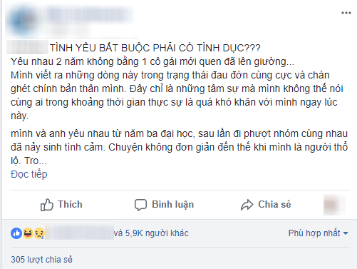 “Tình yêu không đi liền với tình dục, nếu anh ta yêu bạn thật lòng sẽ khiến bạn hạnh phúc và an tâm mỗi khi ở bên chứ không phải lúc nào cũng phải chạy theo đằng sau. Ai cũng có lần đầu tiên, không phải ai làm chuyện gì mới đầu đã giỏi. Anh ta hết yêu nên mới chia tay bạn thôi, đừng tự trách mình!”, tài khoản P.T.L động viên cô gái.