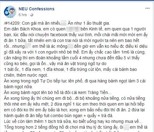 Chẳng biết cô gái trong câu chuyện “Con gái mà ăn nhiều” do nam sinh ĐH Bách khoa kể lại trên NEU Confession có phải là đang “ủ mưu” như trên hay không. Tuy nhiên, sự vô tư, thoải mái của cô nàng đã khiến bạn nam sợ hãi đến nỗi ngay đêm hẹn hò đầu tiên đã phải block nick facebook. Đã vậy, anh chàng còn lên mạng kể khổ, nhờ “500 anh em” vào động viên an ủi và chứng giám cho nỗi sợ hãi của cậu là hoàn toàn có cơ sở. Đối với anh chàng này, chuyện con gái mà ăn nhiều như vị ảo thuật gia là không thể chấp nhận nổi.