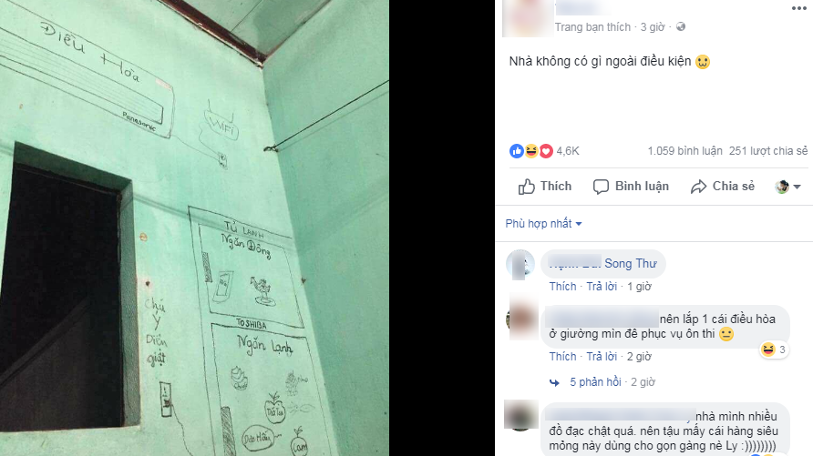Cụ thể, trong căn phòng của B., từ điều hoà mát lạnh cho tới tủ lạnh to uỳnh đầy ắp đồ ăn thức uống đều xuất hiện… qua nét vẽ của thanh niên đang thuê trọ.