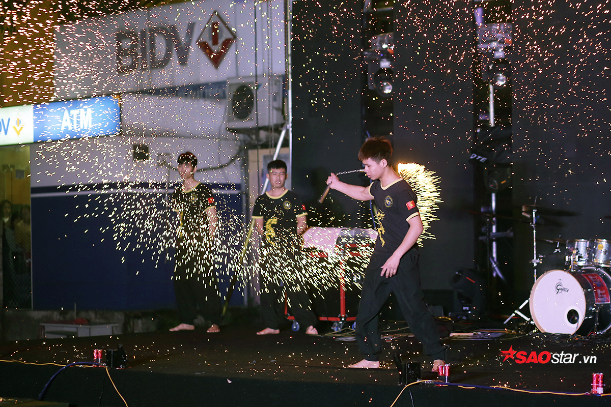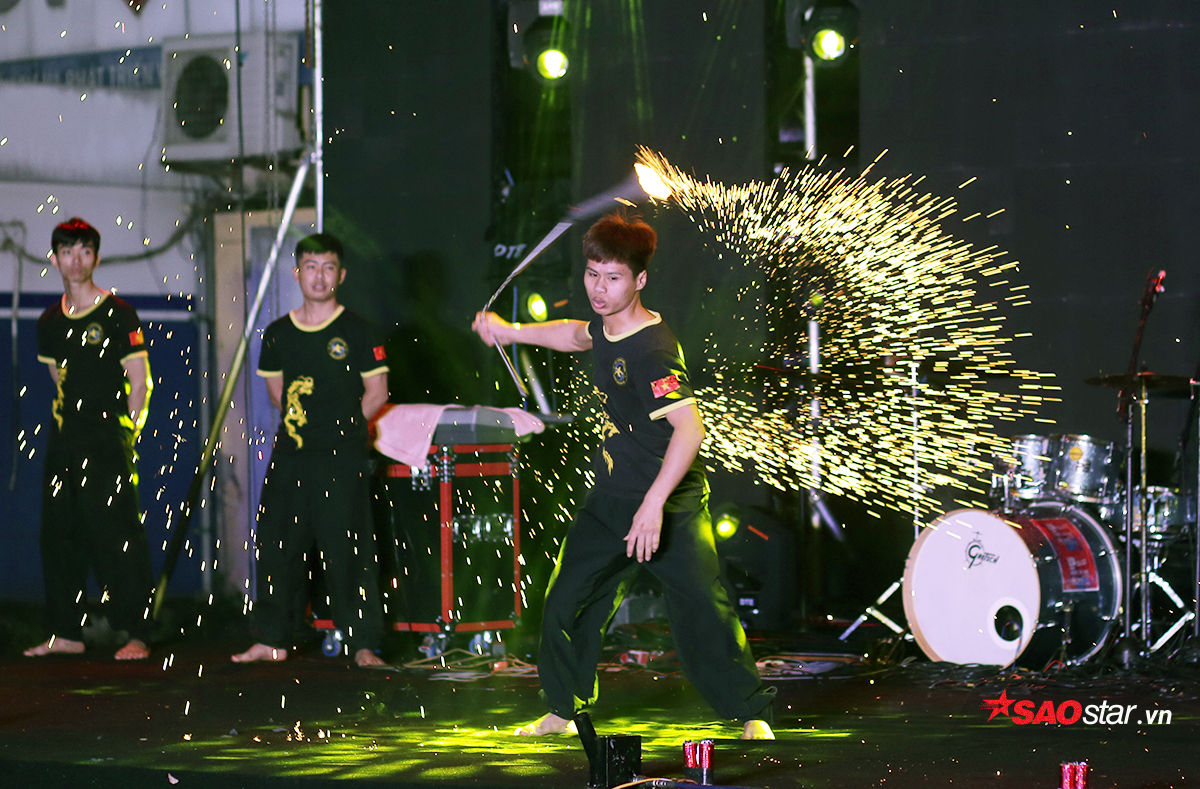 Các chàng trai của CLB Côn nhị khúc mang đến phần trình diễn võ thuật đầy hoành tráng, hấp dẫn, “đốt cháy” sân khấu đêm nhạc
