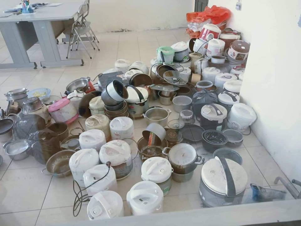 Bức hình hàng loạt nồi cơm, xoong chảo bị tịch thu sau đợt càn quét kiểm tra của ban quản lý ký túc (Ảnh: Lê Diệu Thuý)