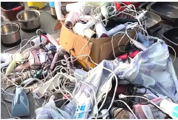 Vô số máy sấy tóc, bàn là bị tịch thu được tập kết thành các đống lớn