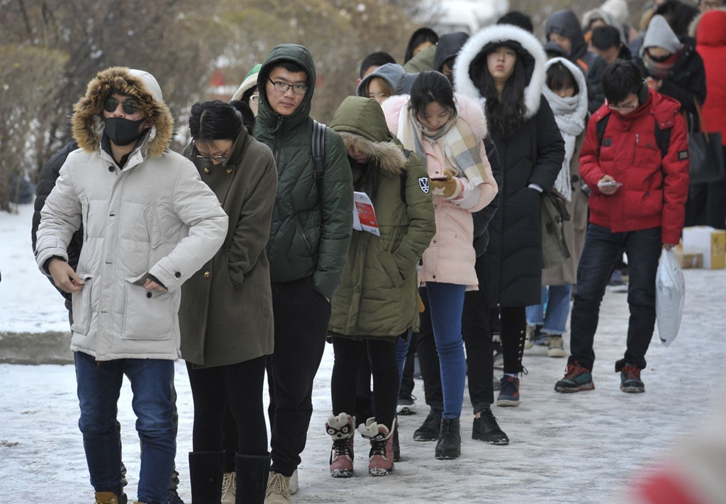 Sinh viên ở Cáp Nhĩ Tân, Trung Quốc xếp hàng chờ lấy các món đồ được đặt vào Ngày độc thân. Ảnh: Getty.