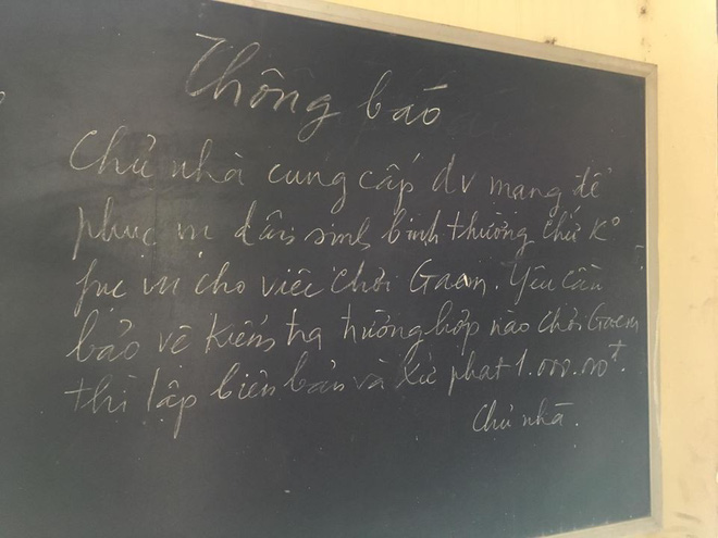 Cũng chính vì sợ đường truyền mạng chậm, một chủ nhà trọ gồm 30 phòng đã viết hẳn thông báo cấm người thuê chơi game trong khu nhà. Nếu bị bảo vệ phát hiện, mỗi lần chơi, người thuê trọ phải chịu phạt một triệu đồng.