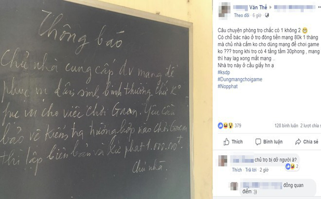 “Câu chuyện phòng trọ chắc có 1 không 2. Chỗ bác nào ở trọ đóng tiền mạng 80 nghìn/tháng mà chủ nhà cấm dùng mạng để chơi game không? Trong khi đó, dãy trọ có 4 tầng, tầm 30 phòng, mạng thì hay lag (đơ) hoặc bị mất… Nhà trọ này ở Cầu Giấy, Hà Nội ạ”, một nam thanh niên bày tỏ bức xúc trên trang cá nhân.