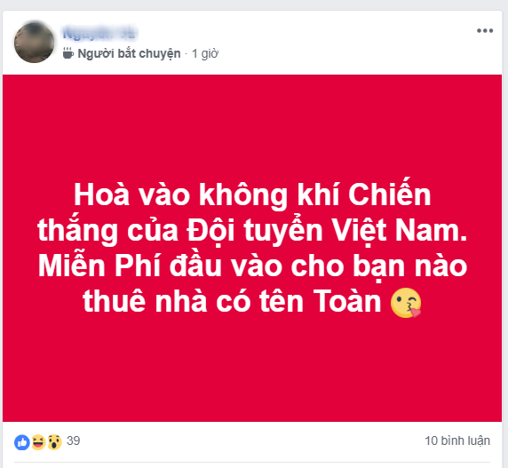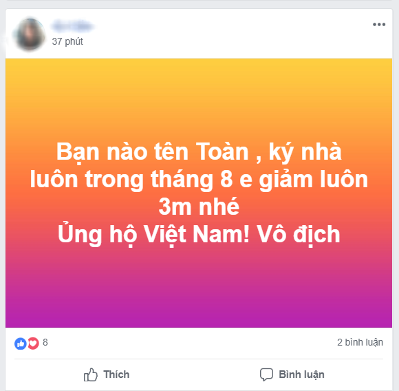 Không thể xuống đường hô vang 2 từ Việt Nam chiến thắng, nhiều bạn du học sinh treo status chúc mừng. Và trên các hội nhóm, hàng loạt những cơn giảm giá cực sốc cho du học sinh tên Toàn khi đăng ký thuê nhà, đi vào nhà hàng ăn uống, mua bộ phát wifi.