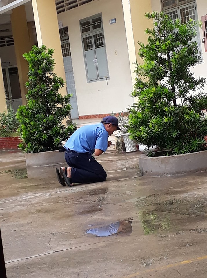 Hình ảnh chú bảo vệ khấn vái được một học sinh ghi lại