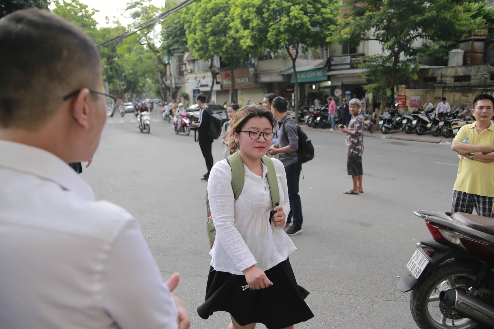 Một nữ thí sinh vội vã sau khi đến sát giờ phát đề.