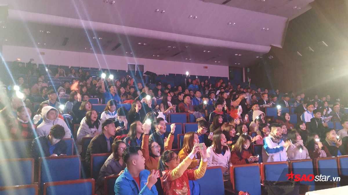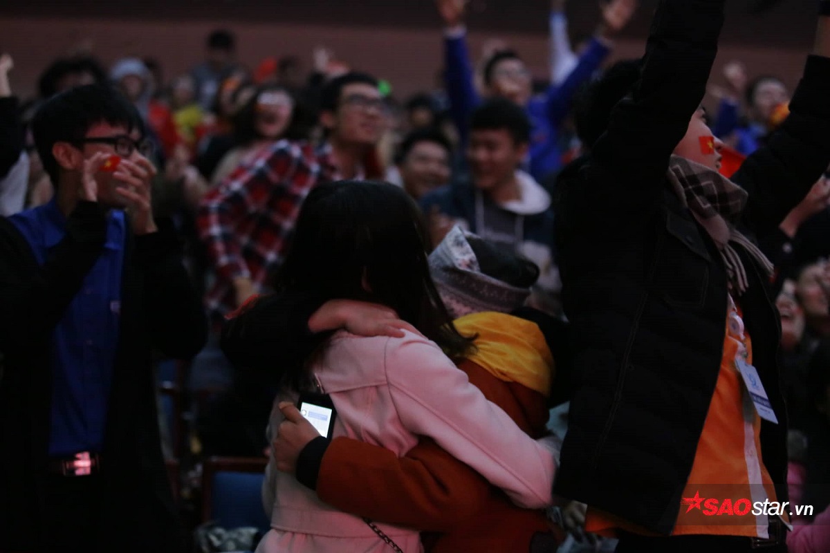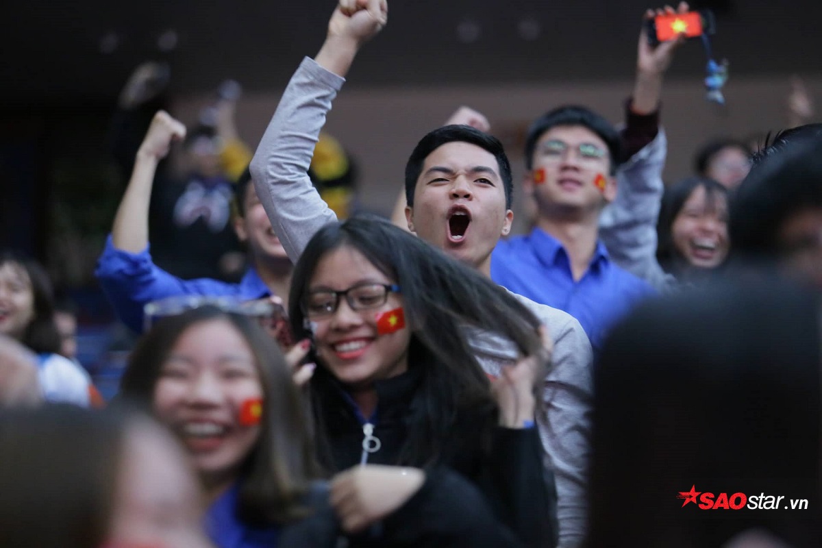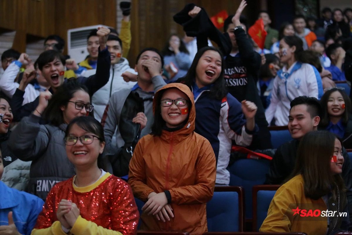 Cùng chung không khí phấn khởi này, hàng ngàn sinh viên tập trung theo dõi trận đấu tại nhà văn hóa sinh viên Hà Nội dường như vỡ òa cảm xúc trước 2 bàn thắng của Huy Hùng và Đức Huy: