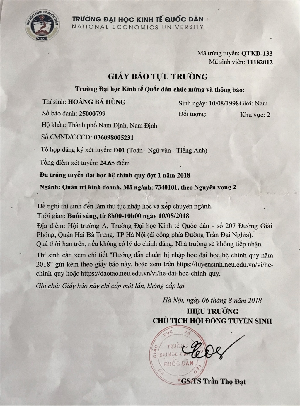 Hiện tại, nam sinh đã chuyển hướng sang học ngành kinh tế. Với điểm xét tuyển là 24,65 điểm, Hùng đã đỗ vào ngành Quản trị Kinh doanh của trường ĐH Kinh tế Quốc dân.