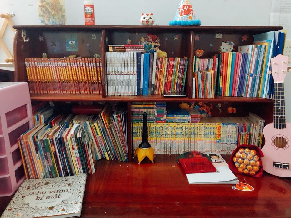 Bàn học có cả bó hoa kẹo mút lẫn một loạt tác phẩm truyện tranh.