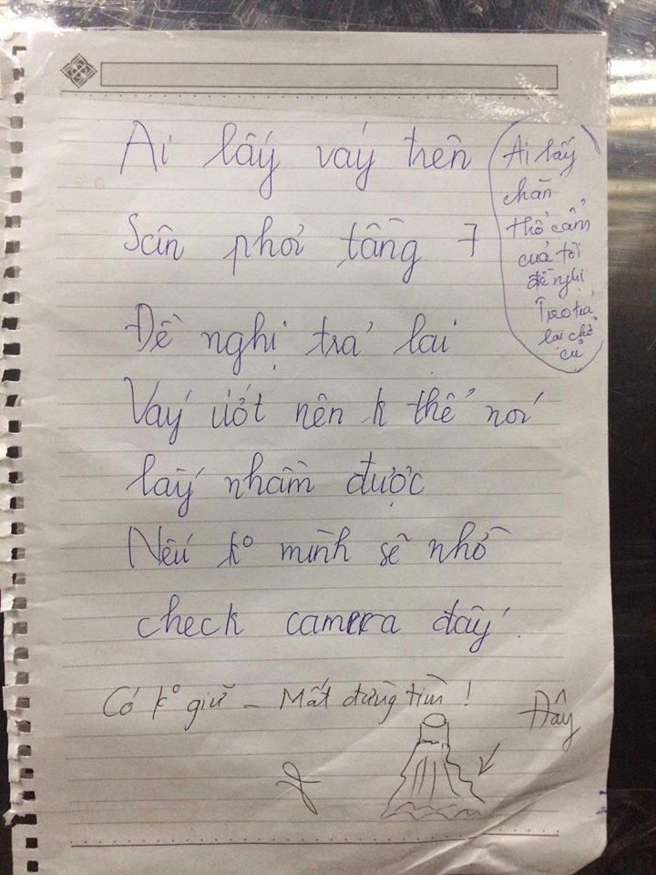 Vì bức xúc, cô gái đã viết lại một dòng ghi chú nêu rõ: “Ai lấy váy trên sân phơi tầng 7 đề nghị trả lại, váy ướt thế không thể nói là lấy nhầm được”.