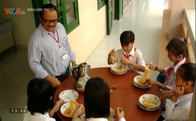 Thầy Thanh nấu mì cho các em học sinh ăn. Ảnh: vtv.vn