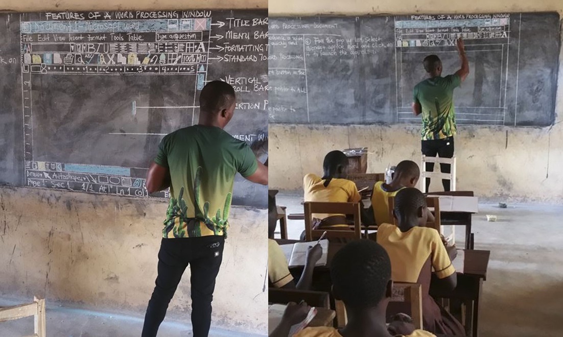 Thầy giáo Owura quyết định sử dụng kỹ năng từng học về nghệ thuật thị giác của mình để vẽ lại dao diện của MS Word lên bảng để giảng dạy cho học sinh của mình.