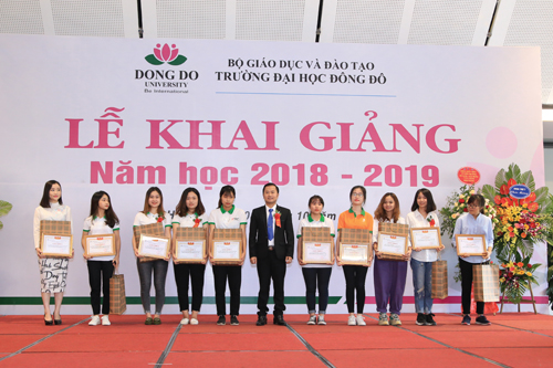 TS. Dương Văn Hòa, Hiệu trưởng trao bằng khen và phần thưởng cho các em sinh viên... trong ngày lễ khai giảng.