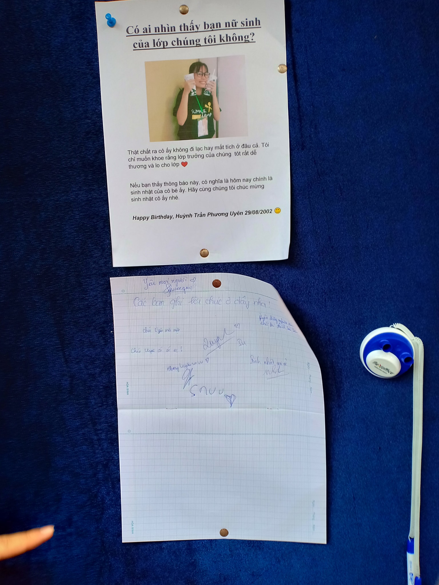 Bên cạnh dán thông báo về ngày sinh nhật của lớp trưởng, lớp học này còn để sẵn tờ giấy trắng để học sinh toàn trường ghi lời chúc mừng.