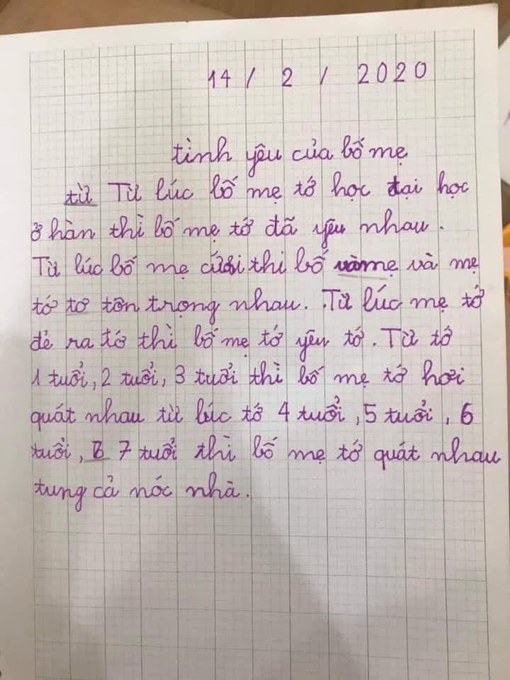 Những bài tập làm văn của các cô cậu tiểu học luôn khiến thầy cô cũng như quý phụ huynh phải “té ngửa” bởi độ chân thật nhưng không kém phần hài hước. Mới đây, MXH vừa xuất hiện 1 bài tập làm văn về đề tài “Tình yêu của bố mẹ” nhân dịp Valentine của một cô bé lớp 1 khiến CĐM cười ngất.