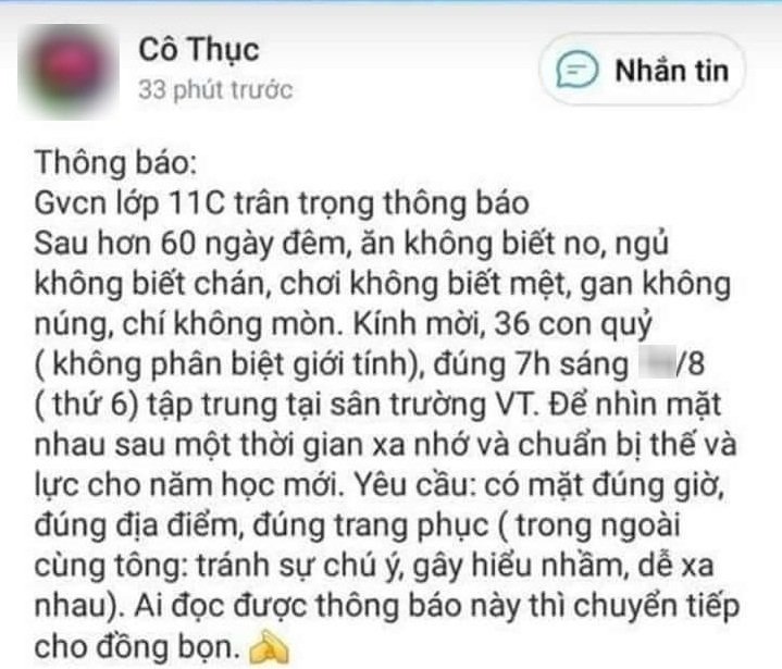 Hiện tại, dòng thông báo vui vẻ, hài hước này của cô giáo Thục vẫn đang được dân mạng chia sẻ nhanh chóng mặt.