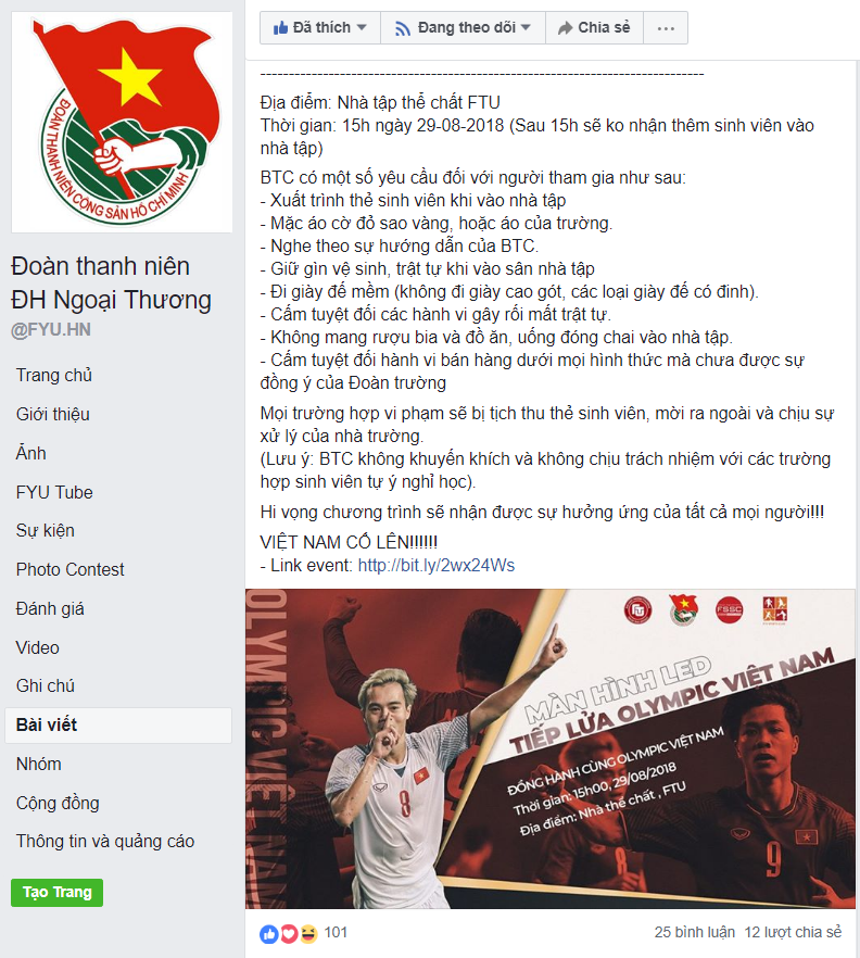Đoàn thanh niên ĐH Ngoại Thương tổ chức cho sinh viên xem đá bóng tại nhà tập thể chất. Trường cũng thông báo 1 số nội dung với các bạn sinh viên khi tham gia xem đá bóng như: mặc áo cơ đỏ sao vàng, xem bóng đá với tinh thần văn minh, đoàn kết…
