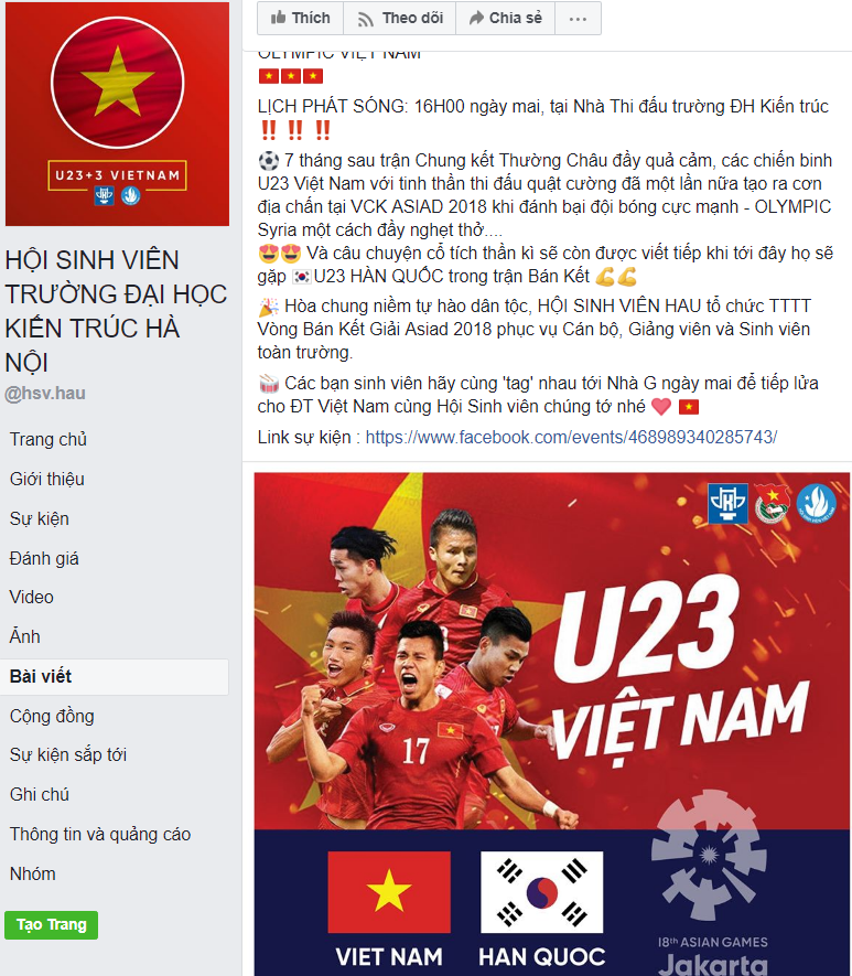 ĐH Nông Lâm Bắc Giang thông báo sẽ tổ chức xem đá bóng tại hội trường lớn B5. Sinh viên có thể theo dõi Olympic Việt Nam đá bán kết ASIAD 2018 với Olympic Hàn Quốc qua màn hình lớn.