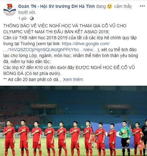 Nhằm thể hiện tình yêu bóng đá, niềm tự hào dân tộc, hội sinh viên ĐH Hà Tĩnh thông báo danh sách từ K7 đến K10 được nghỉ chiều 29/8 để xem đá bóng. Đoàn trường còn tặng 1.000 cờ dán má cho sinh viên.