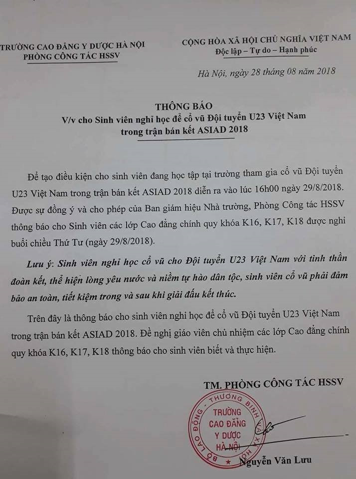 Trường Cao đẳng Y Dược Hà Nội vừa có thông báo cho sinh viên nghỉ học để cổ vũ đội tuyển Olympic Việt Nam thi đấu với Olympic Hàn Quốc. Nhà trường cũng lưu ý sinh viên nghỉ học cổ vũ bóng đá với tinh thần đoàn kết, thể hiện lòng yêu nước và niềm tự hào dân tộc.