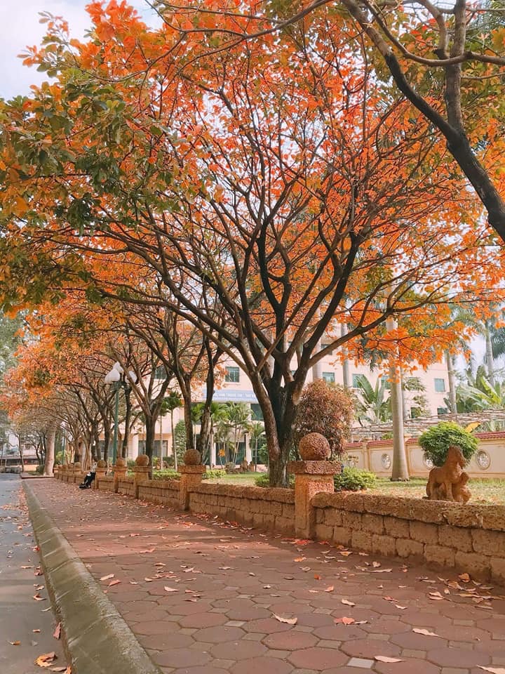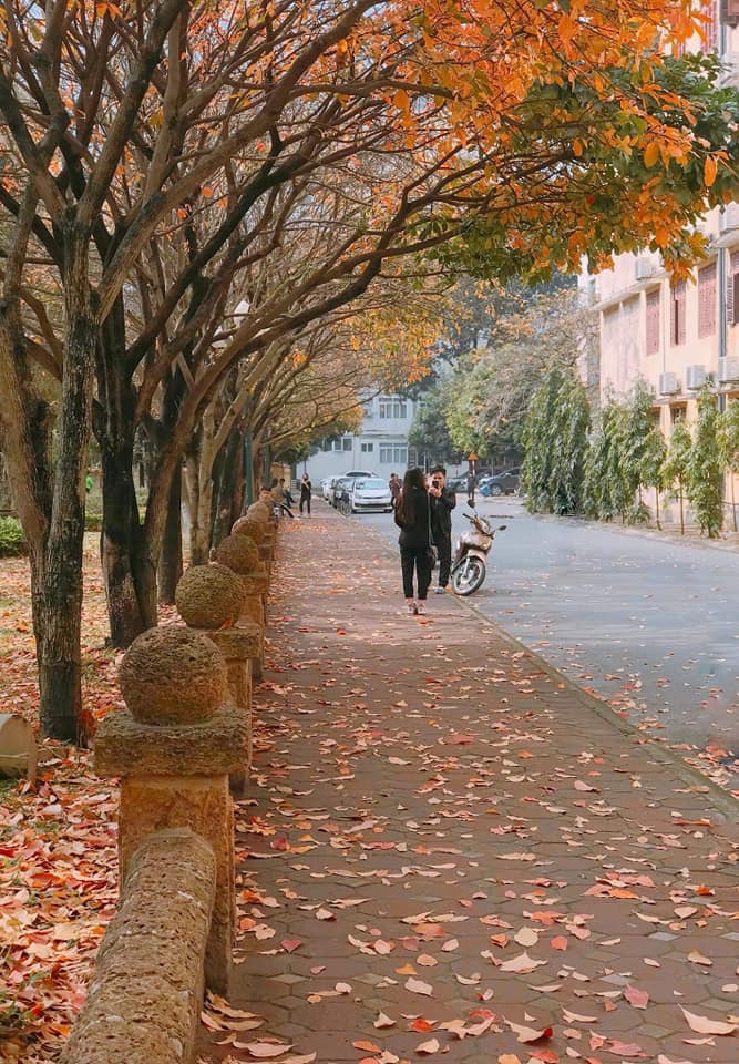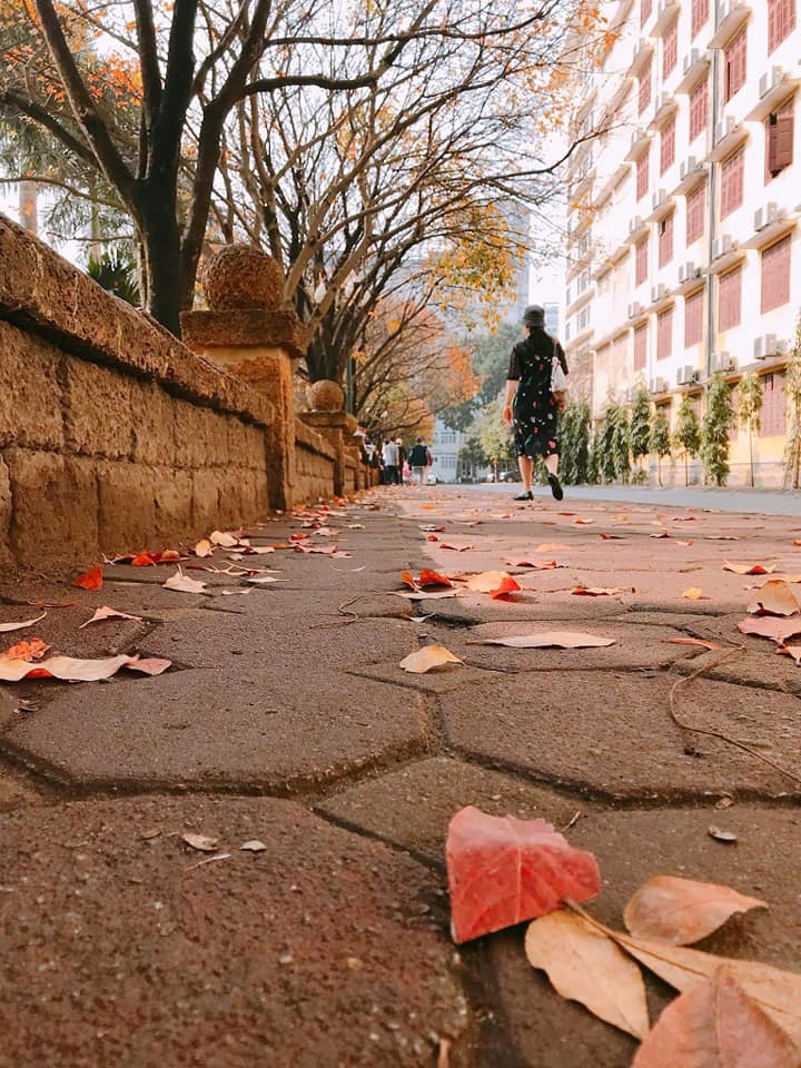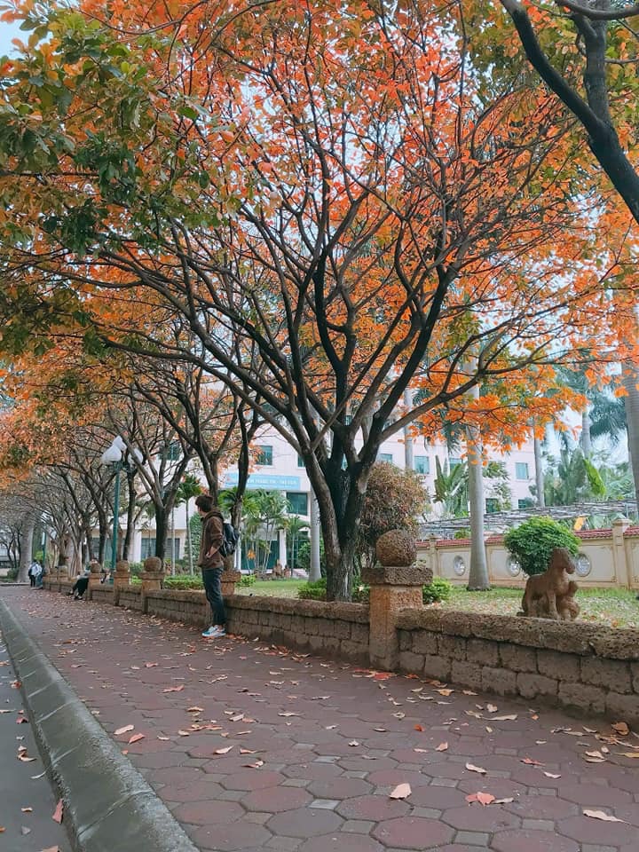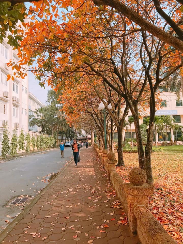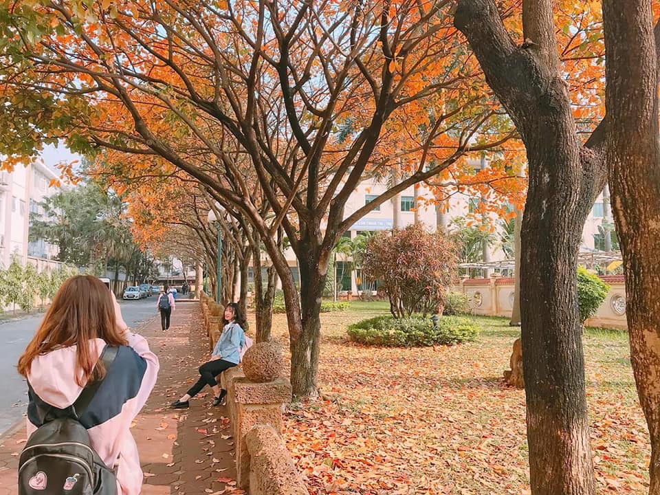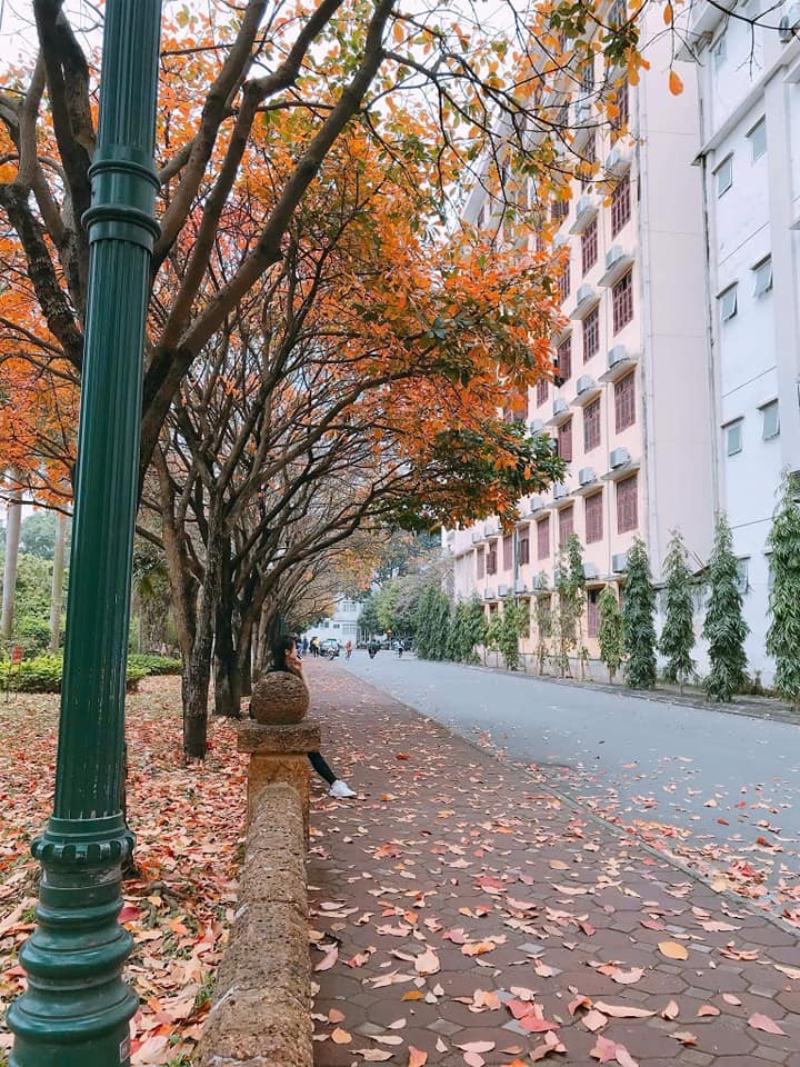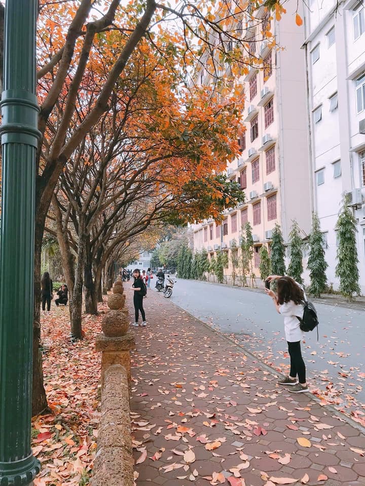 Những ngày này, các bạn trẻ cùng rủ nhau tới “check in” tại một địa điểm đẹp chẳng khác gì ở Hàn Quốc. Con đường ánh nắng chói chang lá rụng đầy như mùa thu, chỉ cần giơ máy ảnh lên là đã có một bức đẹp tuyệt rồi. Không chỉ chụp ảnh sống ảo, mọi người còn có thể nghỉ ngơi, học bài hay trò chuyện với nhau ở nơi đây.