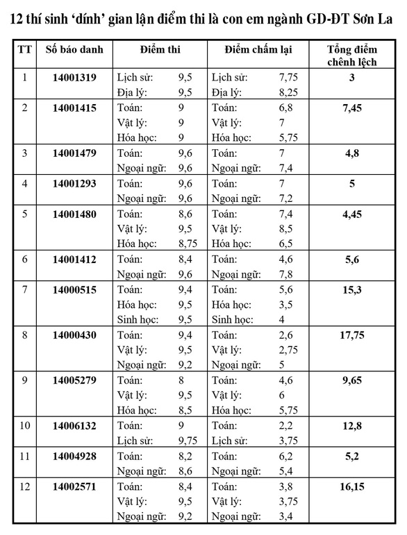 Trong danh sách 44 thí sinh “dính” gian lận điểm thi cũng có tới 12 trường hợp là con em các cán bộ đang công tác trong ngành giáo dục và đào tạo tỉnh Sơn La.