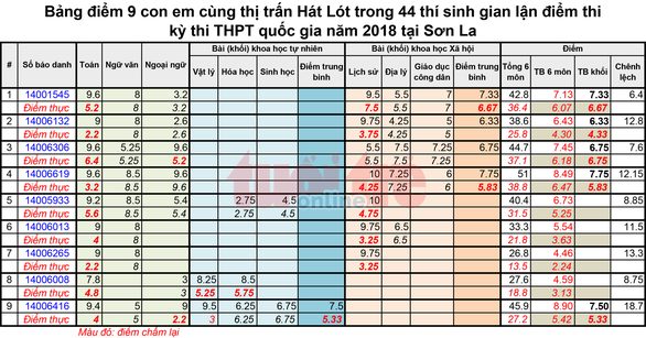 Tuổi trẻ cho biết, thí sinh được sửa điểm nhiều nhất trong danh sách giạn lận ở Sơn La là N.A.T., vốn là con một gia đình buôn bán lớn tại TP Sơn La. Em này có điểm thi THPT quốc gia 2018 ba môn Toán, Lý, Ngoại ngữ lần lượt là 9 - 9 - 9. Nhưng kết quả chấm thẩm định của Bộ GD&ĐT cho thấy điểm số thực ba môn của N.A.T. lần lượt là 0 - 0,25 - 0,2. Tổng điểm ở cả ba môn này đã được sửa nâng lên tới 26,55 điểm.