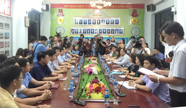 Toàn cảnh buổi họp báo công bố kết quả rà soát, xác minh kết quả thi THPT quốc gia 2018 của 35 thí sinh tại Lạng Sơn. Ảnh: Dân trí.