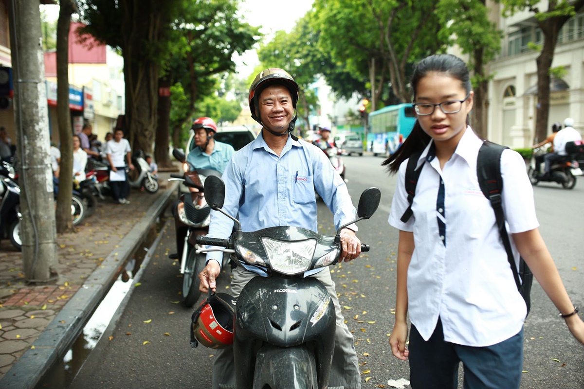 Phụ huynh mỉm cười hạnh phúc dõi nhìn theo con gái bước vào trong khu vực thi.