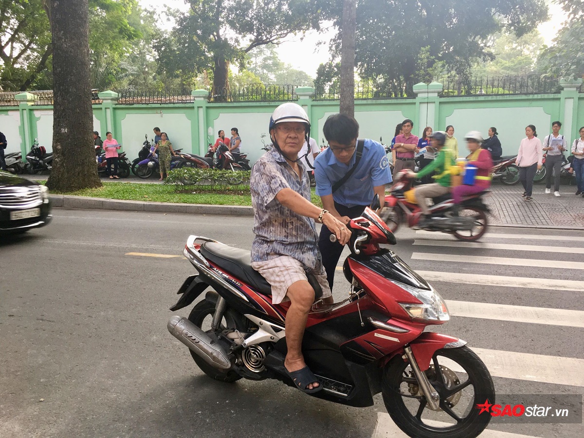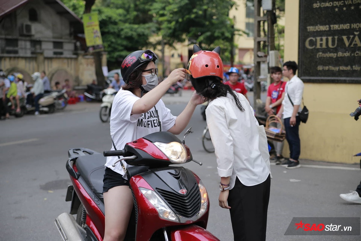 Các bạn thí sinh được phụ huynh quan tâm, gỡ nón bảo hiểm.