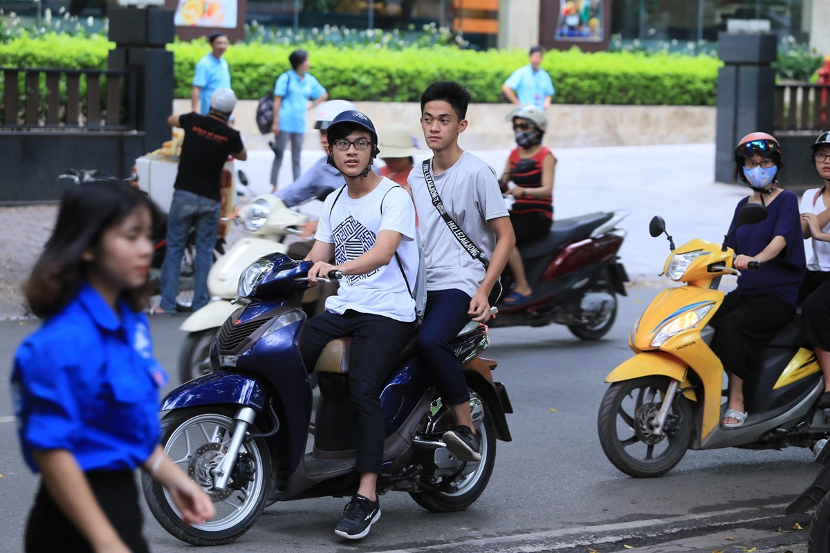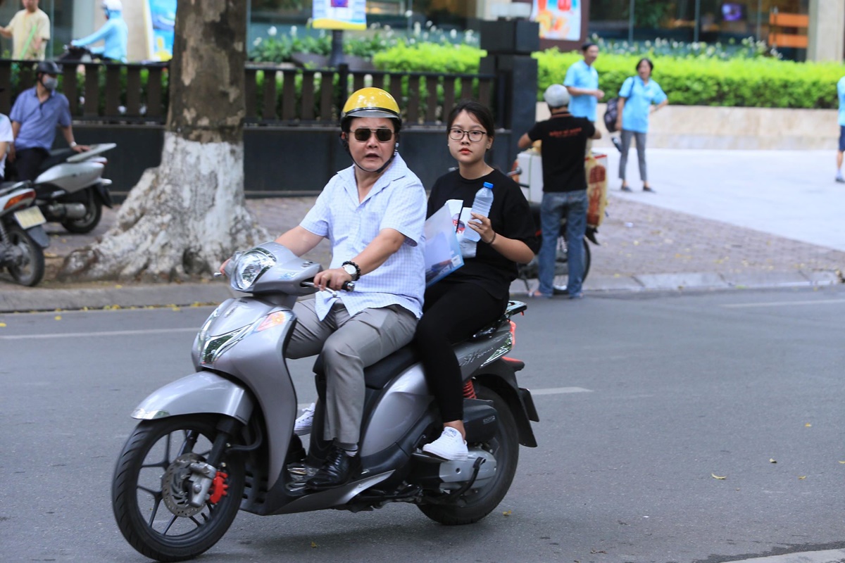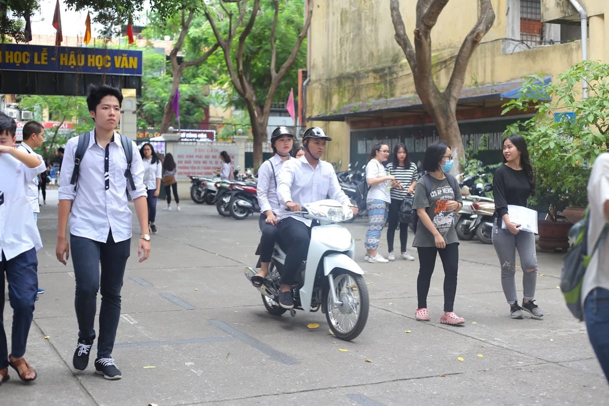 Nhiều sĩ tử dùng xe máy di chuyển vào trong sân trường dự thi.