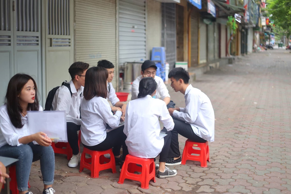 Nhiều bạn ngồi ghế nhựa, tranh thủ ôn bài ở bên ngoài cổng trường.