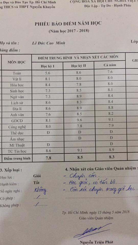 Bảng điểm năm lớp 9 của facebook Cao Minh được nhận xét là “lội ngược dòng” ngoạn mục ở học kì 2.
