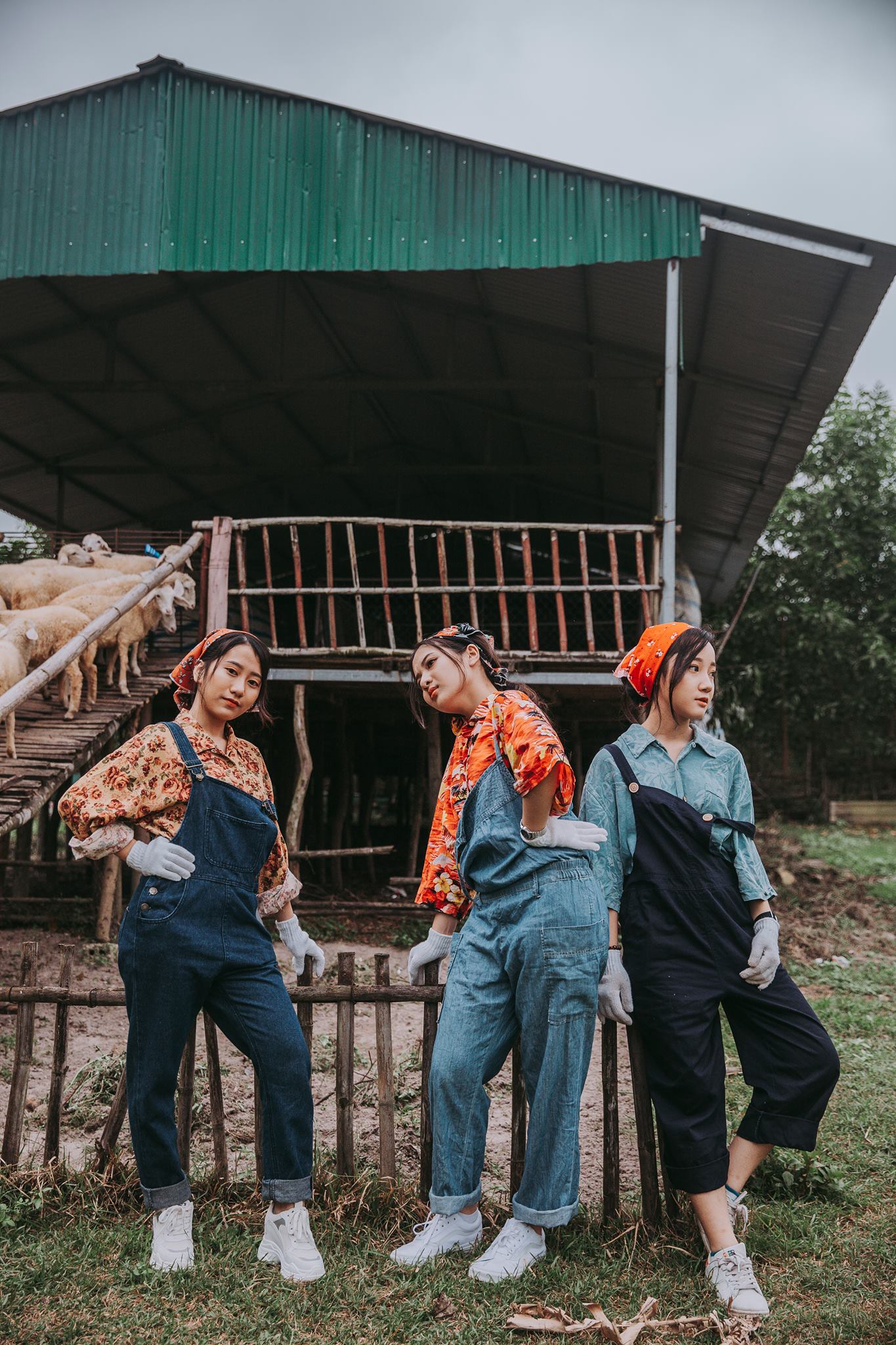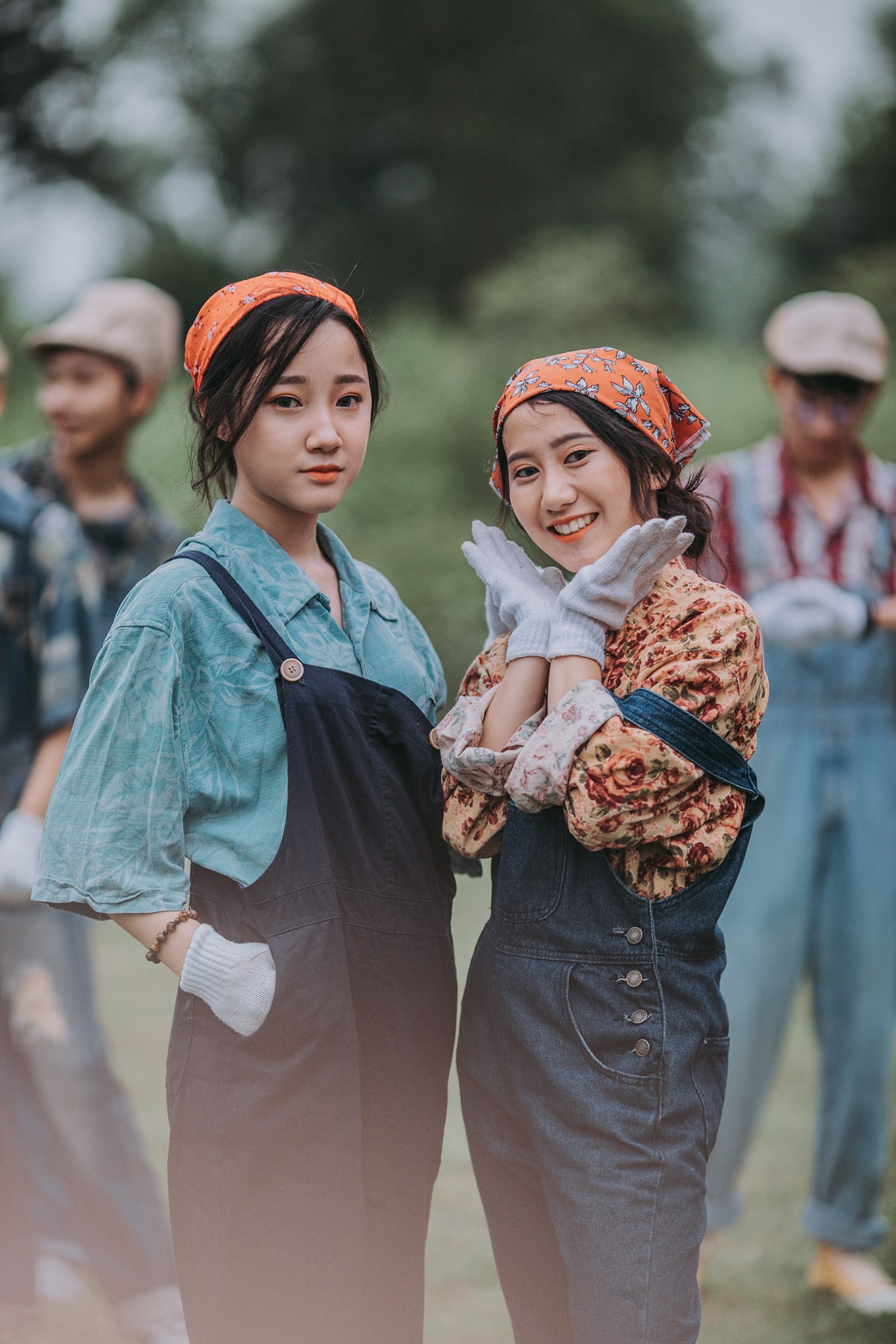 Những chiếc khăn trùm đầu vốn phụ kiện làm đẹp nhưng rất hợp với concept “nét đẹp lao động ở nông trường”.