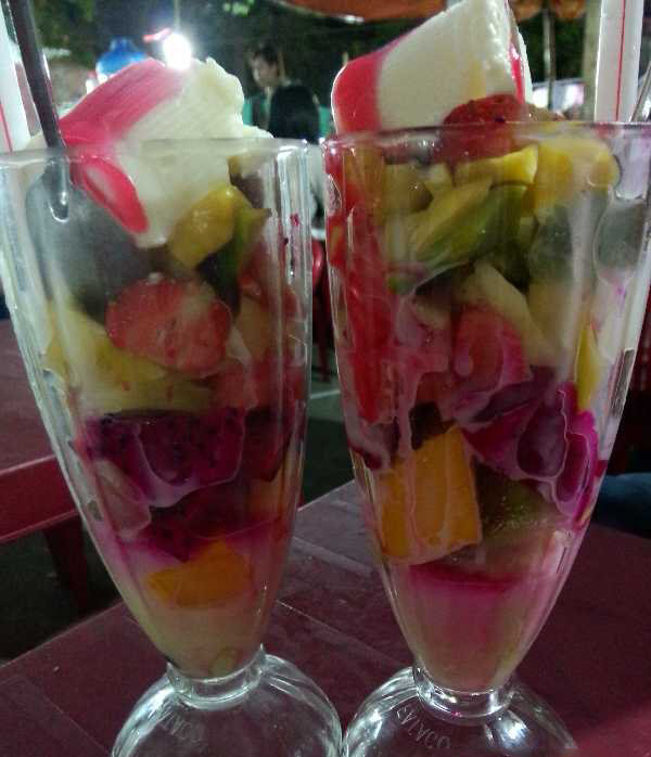 Bạn có thể ăn được cả món mặn rồi đến các món tráng miệng thơm ngon, nổi tiếng ở đây như là trái cây dầm sữa chua, rau câu bánh flan hay bánh tráng nướng. Nơi đây còn liên tục cập nhật những món ngon đúng trào lưu như: Mì cay, bánh mì nướng muối ớt, xoài lắc, kem dừa, trà sữa… Chỉ cần bỏ túi 50.000 đồng, bạn đã được thưởng thức nhiều món ngon, no cả bụng.