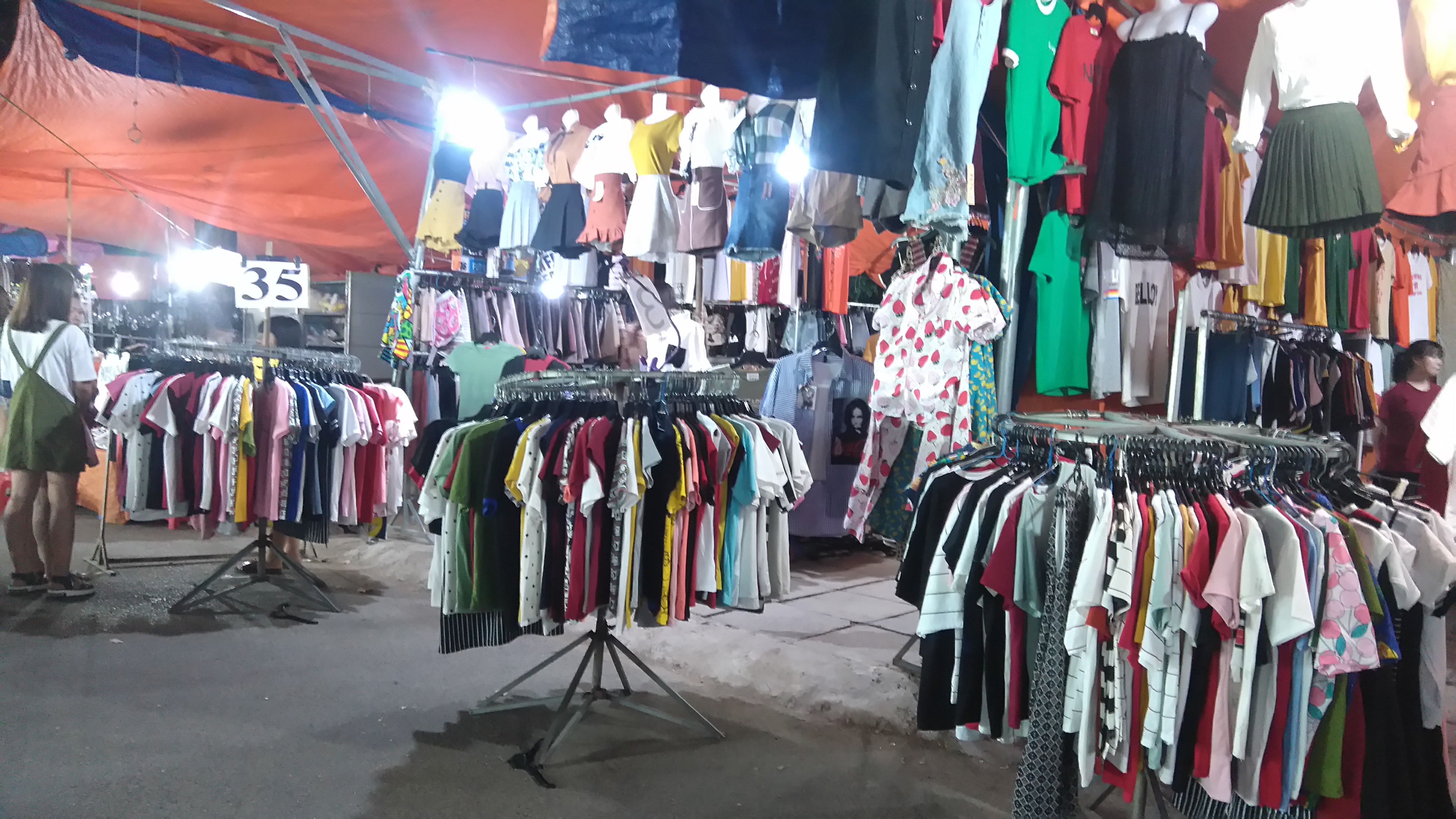 Quần áo đa dạng được sắp xếp gọn gàng trong chợ.