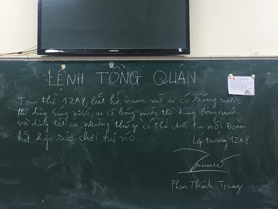 “Lệnh tồng quân. Toàn thể 12A8, bất kể nam nữ ai có súng nước thì dùng súng nước, ai có bóng nước thì dùng bóng nước và dùng tất cả những thứ gì có thể chơi tụi nó. Đoàn kết hợp sức chơi tụi nó. Lớp trường 12A8 (ký tên)”.