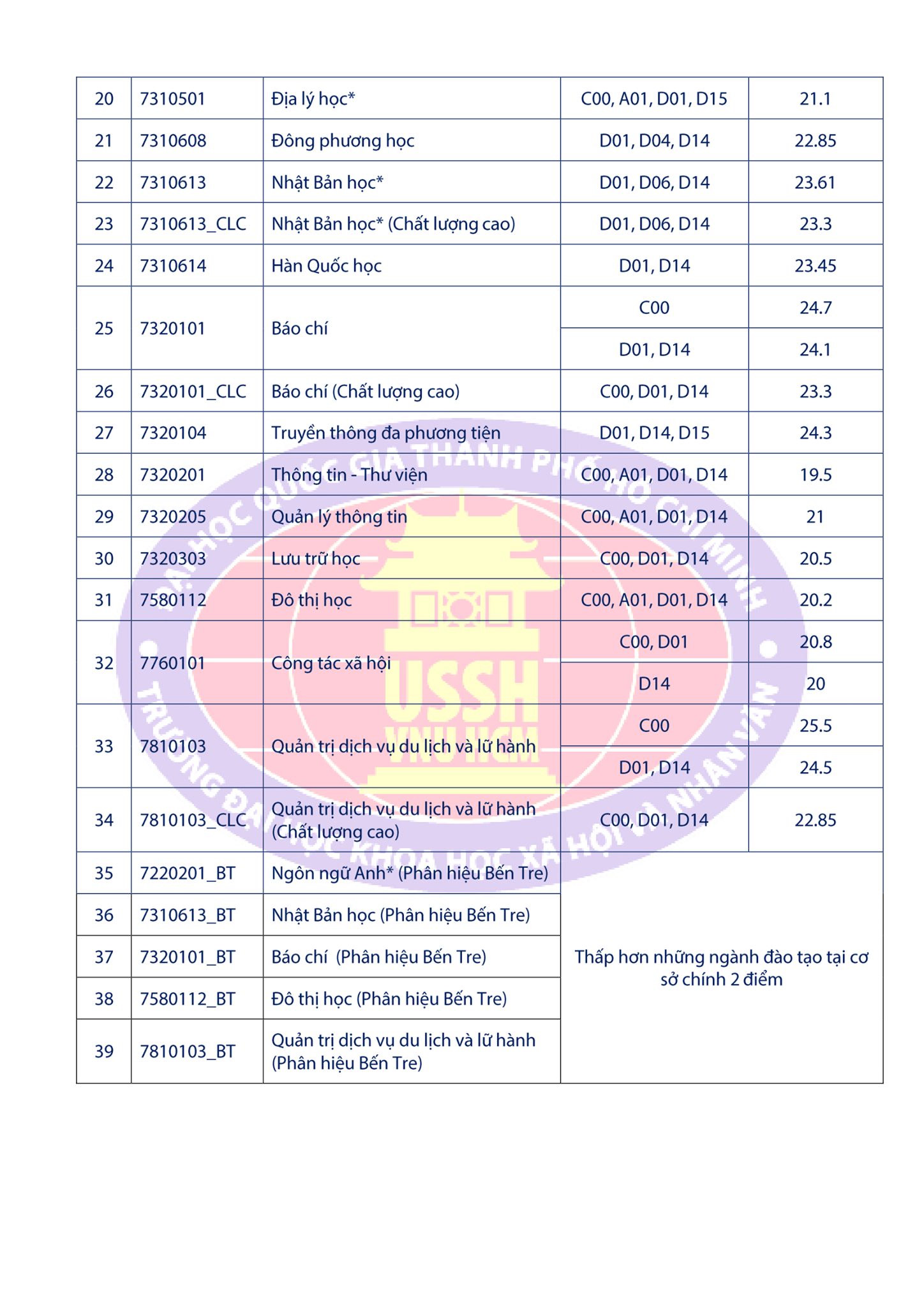 Điểm chuẩn cao nhất thuộc về các ngành: Quản trị Dịch vụ du lịch và lữ hành (tổ hợp C00) với 25.5 điểm, Ngôn ngữ Anh (tổ hợp D01) với 25.0 điểm, Báo chí (tổ hợp C00) với 24,70 điểm, Ngôn ngữ Anh hệ chất lượng cao (tổ hợp D01) với 24.5, Quản trị Dịch vụ du lịch và lữ hành (tổ hợp D01, D14) với 24.5 điểm Truyền thông đa phương tiện (tổ hợp D01, D14, D15) với 24.3 điểm, Quan hệ quốc tế hệ đại trà và chất lượng cao (tổ hợp D01, D14) với 24.30 điểm, Báo chí hệ đại trà (tổ hợp D01, D14) với 24.1 điểm…