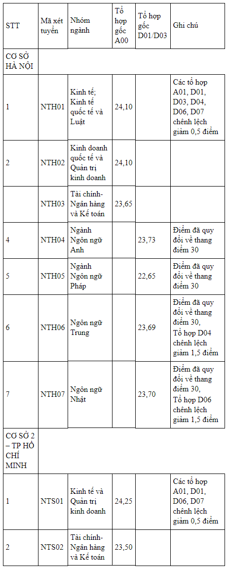 Điểm trúng tuyển của nhóm ngành Kinh tế, Kinh tế quốc tế và Luật (NTH01), Nhóm ngành Kinh doanh quốc tế và Quản trị kinh doanh quốc tế (NTH02) và Nhóm ngành Kinh tế và Quản trị kinh doanh của Cơ sở II-TP. Hồ Chí Minh (NTS01) có điểm trúng tuyển tổ hợp A00 cao nhất tương ứng là 24,1 điểm, 24,1 điểm và 24,25 điểm.