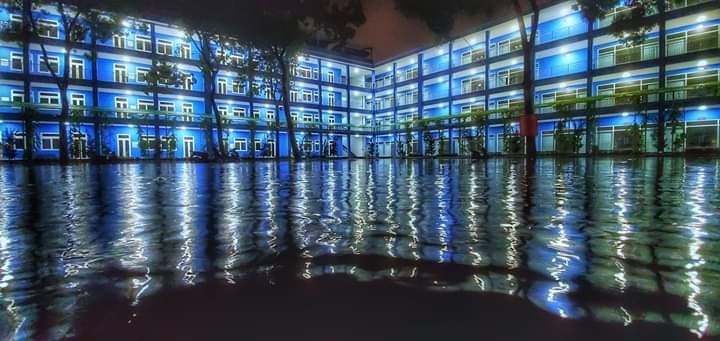 Có thể thấy, mặc dù trời mưa lớn khiến khuôn viên trường bị ngập nặng, tuy nhiên, nhờ sự kết hợp giữa mặt nước long lanh, màu xanh dương chủ đạo cùng ánh đèn điện về đêm đã tạo nên một khung cảnh cực kỳ đẹp mắt, hiện đại và không kém phần lãng mạn.
