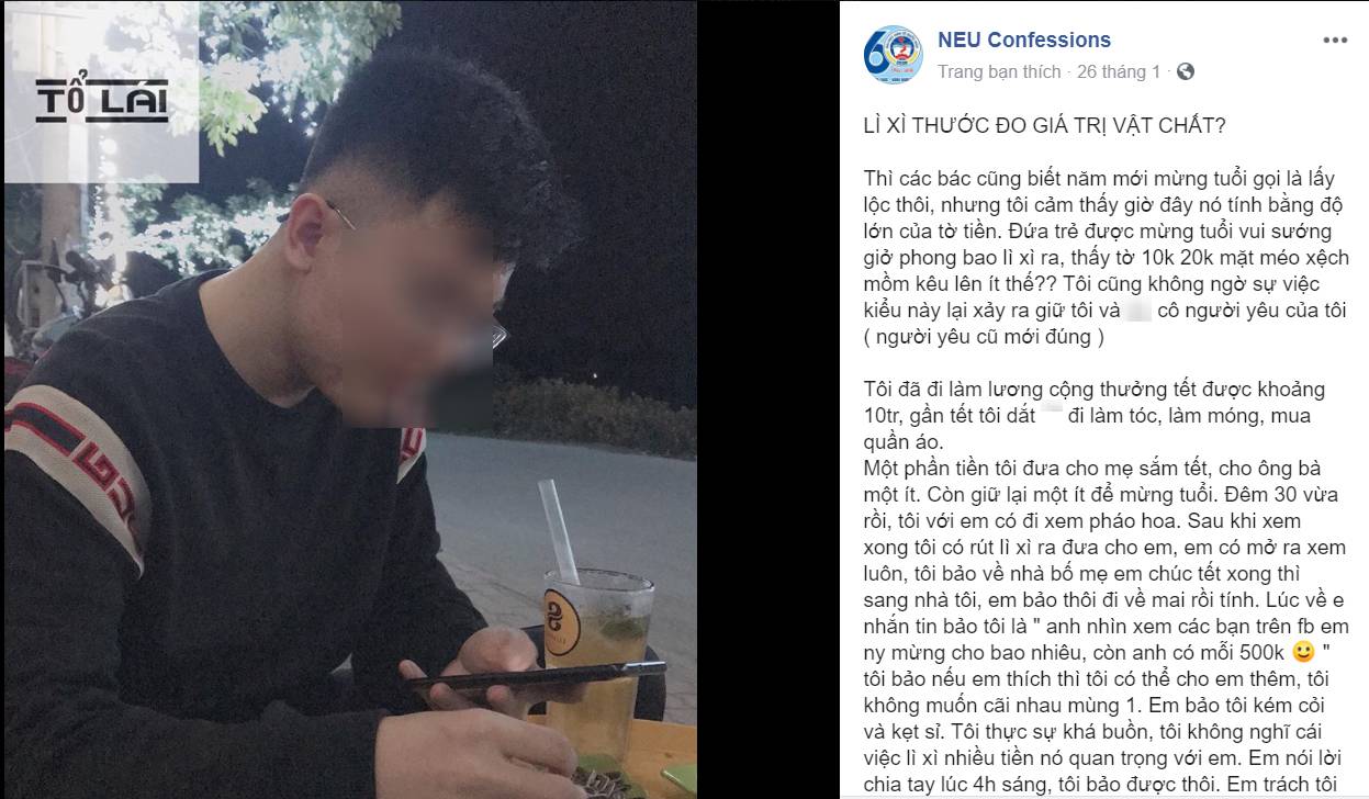 Đó cũng là câu chuyện đáng buồn của một thanh niên trong dịp Tết này, vừa được chia sẻ trên trang NEU Confession đang nhận được nhiều sự chú ý của CĐM. Theo đó, anh chàng đi làm được lương tháng khoảng 10 triệu đồng, đến dịp Tết, anh chàng cũng không tiếc tiền dẫn bạn gái đi làm tóc, làm móng tay chân và mua quần áo. Đến dịp giao thừa, anh bạn còn bỏ vào bao lì xì 500.000 đồng để “mừng tuổi” bạn gái, lấy lộc đầu năm. Những tưởng cô bạn sẽ vui mừng và cảm động, nào ngờ, cô bạn liền mở bao lì xì ra xem và bắt đầu giận dỗi, thậm chí chửi mắng anh chàng này là kém cỏi và kẹt sỉ…