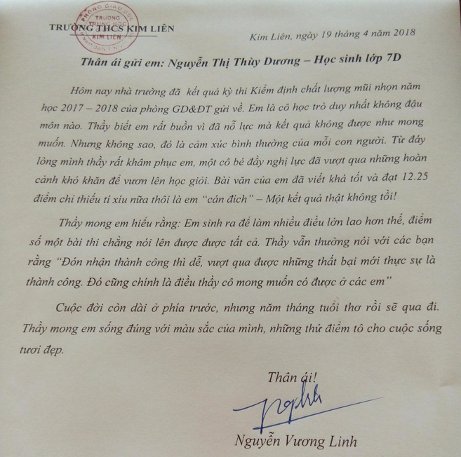 “Em sinh ra để làm những điều lớn lao hơn thế, điểm số một bài thi chẳng nói lên được tất cả”. Đó là những lời thầy Nguyễn Vương Linh, hiệu trưởng trường THCS Kim Liên (Nam Đàn, Nghệ An) đã viết trong bức thư động viên em học sinh thi trượt.