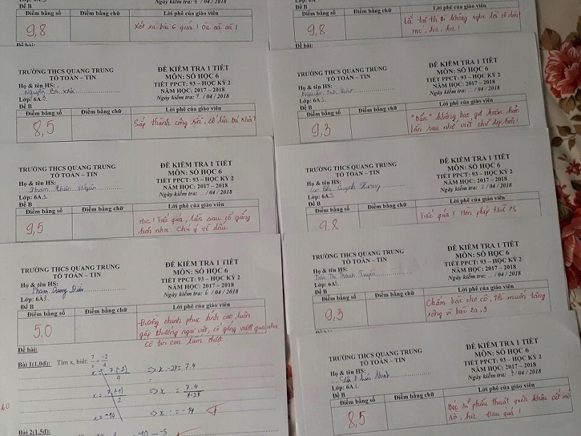 Với những bài kiểm tra điểm kém, cô Huyền dành những lời phê để học sinh không cảm thấy quá buồn: “Đường chinh phục đỉnh cao luôn gặp chướng ngại vật, cố gắng vượt qua nha. Cô tin em làm được”, “Con cần cố gắng thật nhiều nhé”, “Cô rất buồn, con đi học cần chú ý hơn”,…