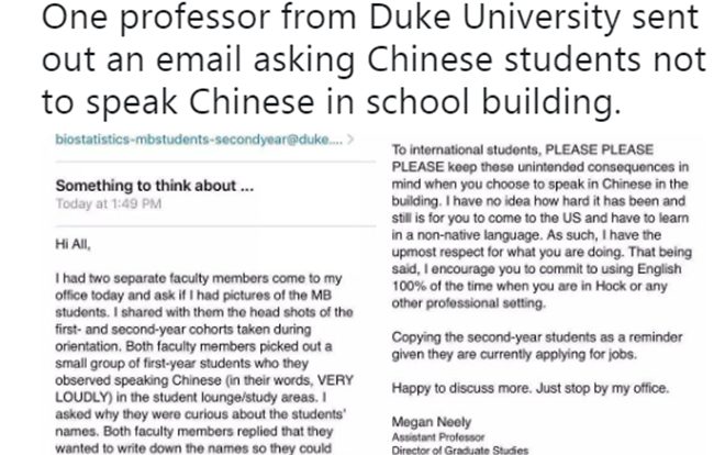 Trong email, bà này viết rằng đã nghe 2 giảng viên trong khoa phản ánh việc một nhóm sinh viên Trung Quốc nói tiếng Trung trong khu vực nghiên cứu và phòng chờ trong khuôn viên trường.