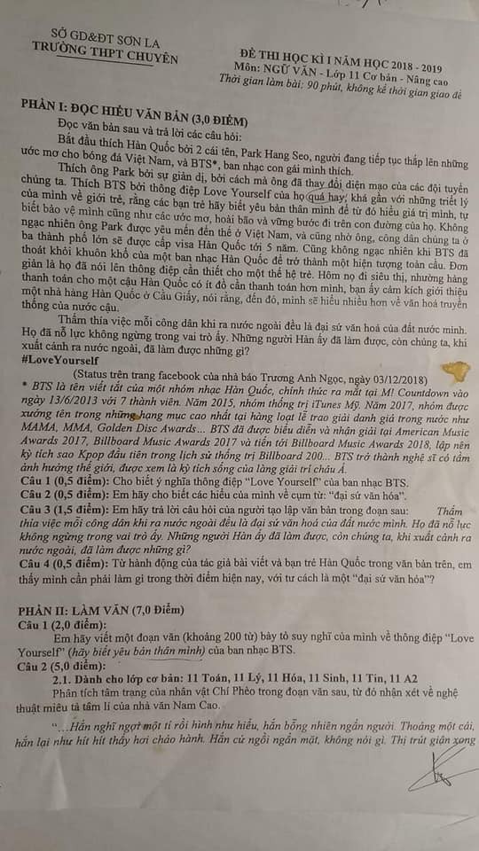 Mới đây, trong đề thi Học kỳ I của lớp 11 trường THPT Chuyên Sơn La, giáo viên đã rất bắt kịp với thời cuộc khi đưa câu chuyện truyền cảm hứng về nhóm nhạc nổi tiếng BTS và HLV Park Hang Seo vào để đặt ra câu hỏi chúng ta đã làm được những gì khi xuất cảnh.
